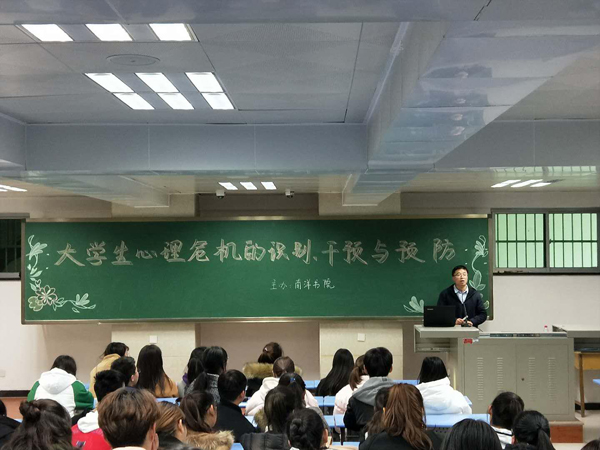 本次讲座由西京学院大学生心理健康中心老师高坡主讲,讲座通过一则幽默风趣的心理测试拉开序幕,帮助同学们更好的认识到自己性格的优缺点。他列举了一些生动的案例讲述了心理危机的识别方法及处理方法,并告诉了同学们西京学院大学生心理健康中心、南洋书院二级心理辅导站的地址、联系人及联系方式。通过与同学们的互动告诉同学们在遭遇心理危机时应该采取的措施,最后告诉同学们如何预防心理危机。
