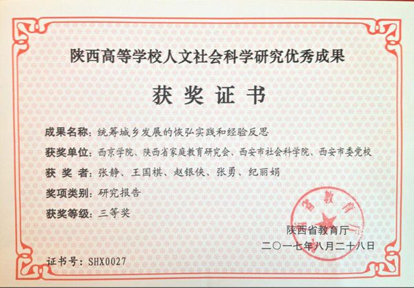 西京网讯:近日从科研处传来喜讯,我校张静教授申报的2017年度陕西高校人文社科成果奖获得三等奖,这是我校2017年度高校人文社科获得的唯一奖项,也是人文社科类横向课题研究报告申报科研成果奖项的新尝试。