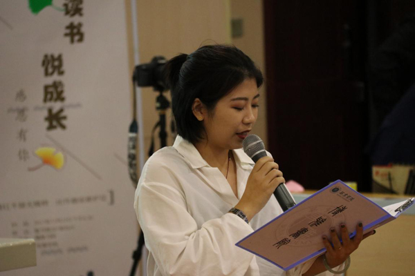 第一个上场的是来自新闻学1502班的尹春莉同学,她悦读的是《你陪我长大,我陪你到老》一文,分享了一个女儿成长路上和父亲的故事,表达了两代人之间细微而真挚的情感,朗读中声情并茂,感情饱满,在场老师观众深受感动,不禁潸然泪下。朗读结束后,现场观众积极分享心得,评委老师则为她作了精彩的点评。整个活动持续了一个半小时,现场气氛热烈,掌声不断。