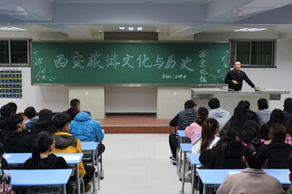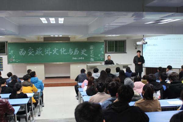 西京网讯:11月23日,允能书院在1408多媒体教室开展旅游知识讲座。此次讲座特邀西安理工大学人文与外国语学院王群沣老师,王群沣用中英文双语为学生主讲了西安历史与旅游文化。