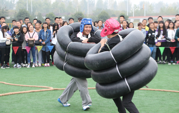 本次运动会以放松身心、愉悦生活为主旨,采取竞赛形式进行,共有相扑运动、协力竞走、袋鼠跳、 8人 9足、沙包打靶、吹气球等共8项趣味运动项目。经过前期广泛宣传,同学们踊跃报名,每位辅导员都挑选了精兵强将组建了自己的代表队参赛。