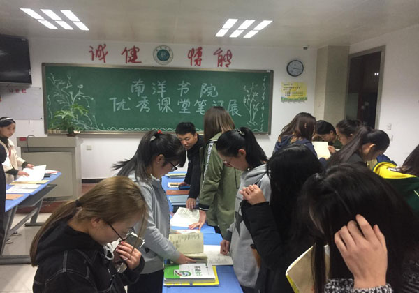 ——举行南洋书院优秀课堂笔记展活动。有质量才有核心竞争力,教育质量是教育的生命线,南洋书院加快推进学校内涵式发展进程,努力构建全方位、立体化的教学质量保障体系。课堂笔记是学生学习过程的重要见证,也是保障课堂教学质量的重要环节,更是学风建设的重要组成部分。日前,南洋书院组织各班学习委员参与教学检查,期间,各班学习委员认真遴选优秀课堂笔记共206本,并举行优秀课堂笔记展活动。活动过程中,书院学生在观摩学习的同时,认真剖析差距,客观分析发生问题的成因,并表示在以后的学习中,向优秀看齐,进一步端正学习态度,明确学习目的,改进学习方法,养成良好的学习习惯。