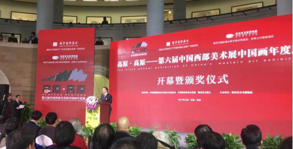 陕西省宣传文化部门领导以及来自全国各地的美术界人士500余人见证了这一中国西部美展的嘉年华。获得西部人画西部版块的42位作者和学术邀请展画家、团体邀请展画家代表在掌声中走上主席台,接受获奖证书。这届“高原展”获得“文化部2017年国家艺术基金支持项目”,展览活动仍由四大版块组成,西部人画西部版块223件作品和学术邀请展东西南北四人40余件作品及团体邀请广西书画院近30件作品,总计近300件中国画佳作亮相本次大展,可谓金秋季节呈现给观众的视觉盛宴和精神大餐,更是广大美术工作者献给“党的十九大”的一份厚礼!