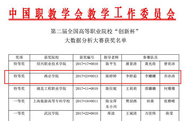 西京网讯:11月16日由中国职业技术教育学会教学工作委员会主办的第二届全国高等职业院校“创新杯”大数据分析大赛在湖北工业职业学院落幕,来自全国43所高职高专院校的近100支代表队提交了参赛作品,经过由大数据分析知名企业和高等院校专家组成的评委共同评议,全国共近30支队伍获得奖项。我校参赛队伍分别获得国家特等奖、二等奖及三等奖。