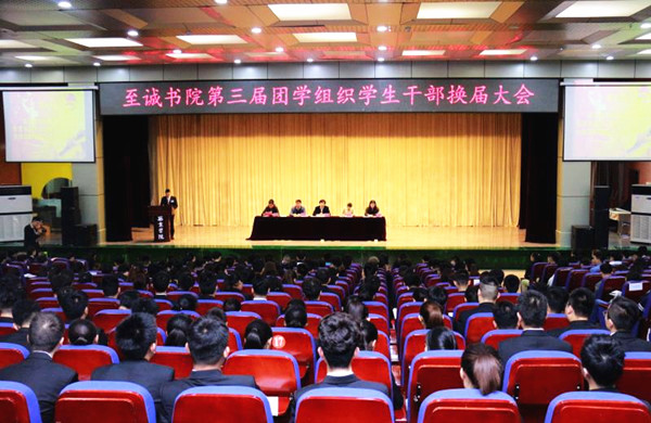 西京网讯:10月29日上午,至诚书院第三届团学组织学生干部换届大会在小礼堂举行,至诚书院分党委书记、至诚书院院长李贺,至诚书院分党委副书记、副院长程永清,至诚书院分党委青年委员、学生事务科科长高玉枝,至诚书院分党委组织委员韩丽娜,至诚书院分团委书记李守晶等老师及团学组织全体学生干部,各班级团支书、班长参加大会,大会邀请往届优秀学生干部校友参加。会议由至诚书院分团委第三届学生常务副书记刘嘉宁主持。