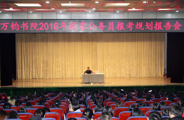 西京网讯:为指导万钧书院2014级有意向报考公务员的学生合理正确报名,能够在较短的时间内更好的准备国家公务员考试,并帮助2015级学生正确认识公务员工作及公考相关流程。11月5日,万钧书院励志书院班在我校小礼堂举行2018年国家公务员报考规划报告会。