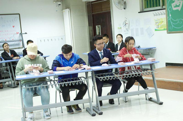 至诚书院辅导员程波、武旭、姚军峰、周张莉老师作为评委参与了本次活动。在比赛中,每位参赛选手都采用了自己的“看家本领”与对手“殊死搏斗”,一位以听钞的方式数钞的同学惊艳全场得到了众多同学们的热烈掌声,使之前还无比安静的教室一下子被同学们高涨的热情所点燃。在紧张的氛围中,时间悄然流逝,本次大赛也在最后一位同学放下手中的钞纸结束了。最后由辅导员程波老师做出了精彩的点评。