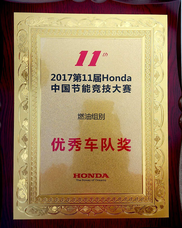 西京网讯:近日,2017第11届Honda中国节能竞技大赛在广东国际赛车场圆满闭幕,我校机械工程学院学子与清华大学、同济大学、西安交通大学、北京理工大学等“双一流”建设高校学子同台竞技,以307.98km/L的成绩在全国高校66支燃油代表队中荣获第9名,在陕西省高校参加的5支燃油组队伍中,荣获第1名。荣获本次大赛燃油组别优秀车队奖,创本赛事历史新高。