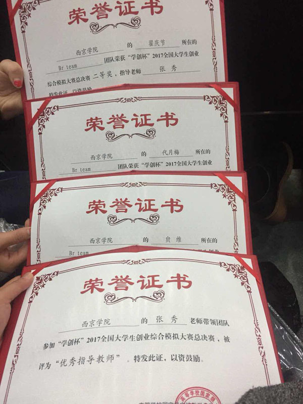 西京网讯:10月21日到22日,由高等学校国家级实验教学示范中心联席会主办的“学创杯”2017大学生创业综合模拟大赛全国总决赛在湖北经济学院举行,来自江苏大学、南京财经大学、西南财经大学等在内的100多所高校、100余支队伍、300余名学生参与了此次比赛。从今年3月份开始,经过张秀、宋翔南两位老师的精心选拔和耐心指导,在今年5月份举办的陕西省省赛中,我校2支队伍获得省级一等奖,并代表我校参加全国总决赛。本次全国总决赛为期两天,经过第一天软件模拟经营比赛,第二天是策划书PK环节,我校2支队伍喜获国赛二等奖的好成绩。指导老师张秀被评为“优秀指导老师”称号。