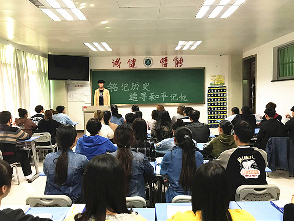 本次活动学生以“铭记历史、追寻和平记忆”为主题召开专题班会,回顾历史真相,围绕“淬火砺剑”深入思考、进行广泛讨论。对此还举行主题演讲比赛,在烈火中永生的邱少云,英勇献身堵枪口的黄继光,不畏生死的吕松山使同学们记住的英雄人物,演讲学生表示‘不忘历史,不是宣泄情绪,不是延续民族仇恨,而是要避免历史悲剧重演’。