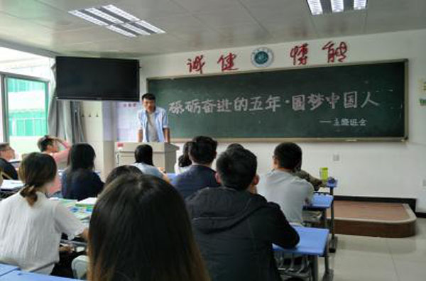 ——开展“砥砺奋进的五年•圆梦中国人”主题班会。以班级为单位组织开展主题班会,利用身边的各类先进典型代表,以真人、真事和真实情感,讲述了党的十八大以来自觉把个人梦想融入国家和民族的伟大梦想之中的追梦圆梦故事,汇聚当代大学生同心共筑中国梦的强大正能量。