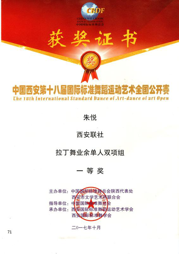 来自我校博雅书院新闻采编与制作15级学生朱悦,经过顽强拼搏,激烈的争夺以优异的成绩夺得了本次比赛拉丁业余单人双项一等奖。