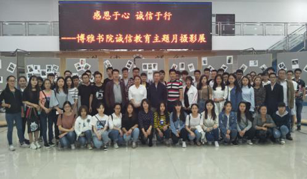 西京网讯:为全面贯彻落实家庭困难学生资助政策,实现资助与育人相结合的目的,博雅书院结合学生专业特色及实际现状,于5月22日在大学生发展与服务中心举办“感恩于心·诚信于行”摄影展,大学生发展与服务中心主任张京鹏、博雅书院院长冯春燕、副院长王培涛、事务科科长张理斌、校资助中心陈翌及书院老师和部分学生代表观展。