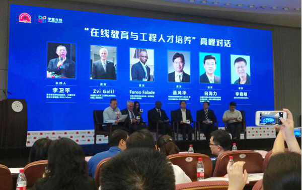 论坛对话从11:00-12:00,慕华教育研究院院长、中国科学技术大学教授,IEEE Fellow李卫平主持,嘉宾Zvi Galil,非洲工程教育协会主席、尼日利亚拉各斯大学教授Funso Falade,教育部在线教育研究中心副主任、清华大学副秘书长、学堂在线董事长聂风华,白海力,北京大学在线教育负责人、北京大学教授李晓明分别回答其他参会者的有关问题。