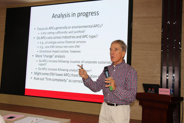 西京网讯:创新是一个民族的灵魂,是一个国家兴旺发达的不竭动力。为进一步促进学生创新意识培养和创新能力提升,开阔眼界,开拓思维,提高研究生和本科生教学质量。6月6日上午,会计学院邀请美国加利福尼亚大学戴维斯分校(University of California-Davis)商学院副院长、会计学资深教授Paul A. Griffin来我校进行学术交流,在会议楼第二会议室作了题为Environmental performance and analyst information processing costs(环境绩效与分析师信息处理成本)的学术报告,报告会由会计学院院长李海霞主持,会计学院教师及研究生和本科生代表150余人聆听报告。
