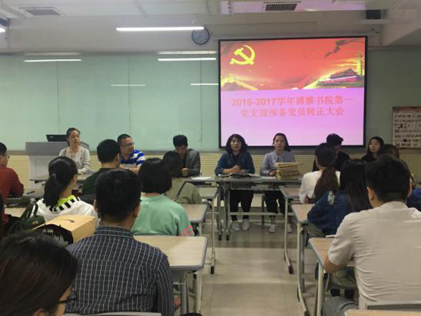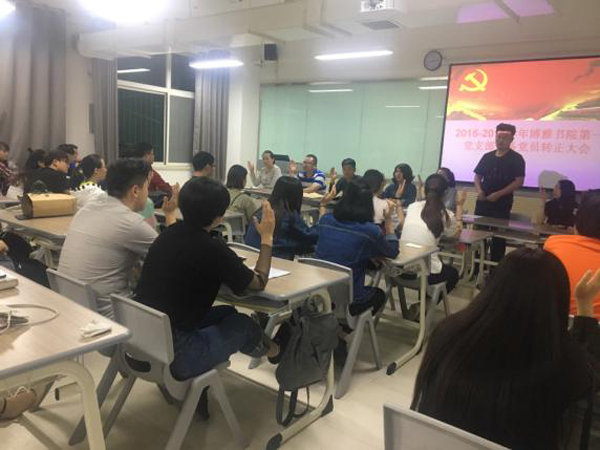 会议最后,书院分党委副书记王培涛同志对各位党员提出两点希望:第一,希望大家能够记住今天这个特殊的日子,并继续加强党的理论知识学习。第二,告诫大家一定要遵守校规校纪,随时随地的起到先锋模范作用,思想上要和学校保持高度一致,时刻保持党员的先进性。转正会议议程在庄严而热烈的气氛中圆满结束。