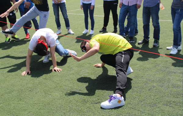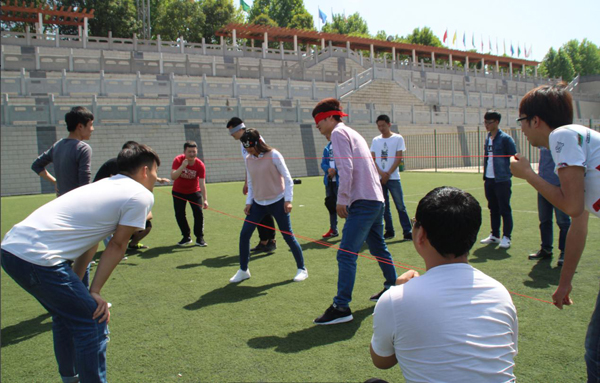 活动开始,主持人介绍了本次活动的规则,每队先选出两个人拉着绳子,距离地面一米,挑战的同学戴上眼罩,由主持人将第一位穿越的人带入绳子前面,参赛者通过听从队友指挥以身体不接触绳子的方式“穿越”。同学们以各种姿势渡过眼前的“生死线”(绳子),所用时间最少的评为冠军。游戏过程中同学们互相配合,各组成员在组长的带领下,团结一心,努力完成游戏项目,充分发扬了同学们团结协作的精神,展示了同学们的无限活力。通过本次活动让大家认识自我,探讨自我,增强团队意识,了解团队协作的重要性,彼此之间的关系也得到了进一步加强。