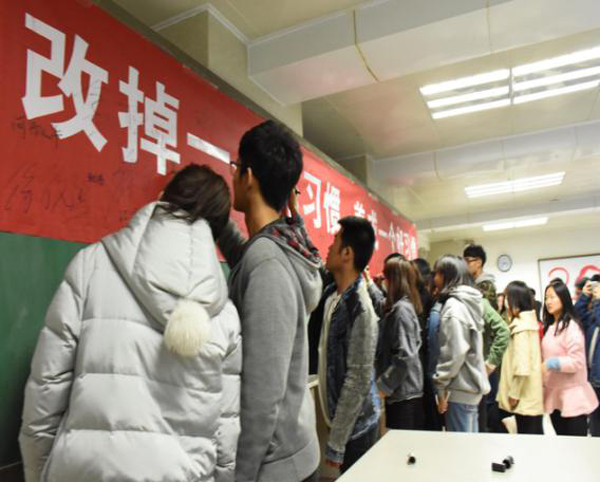 ——举行“改掉一个坏习惯,养成一个好习惯”签名活动。为进一步推动书院“爱国爱校卫生”运动,号召书院全体学生以主人翁的态度积极投身爱国爱校卫生工作中来。近日,书院学生会在2号教学楼举行“改掉一个坏习惯,养成一个好习惯”签名活动。 签名活动开始前,学生会向书院学生发出倡议:积极行动,以主人翁姿态投身爱国爱校卫生运动;倡导学生养成文明的生活方式;倡导自觉维护美好校园环境;倡导以节约为荣;倡导校园安全文明。随后,学生会学生带头在“改掉一个坏习惯,养成一个好习惯”的横幅上签下了自己的名字,在他们的带动下,学生热情高涨,踊跃参与。大家表示,要从我做起,从小事做起,以实际行动积极参与爱国爱校卫生运动。