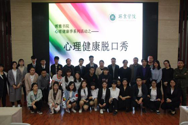 西京网讯:为贯彻和落实陕西省高教工委、我校有关心理健康季的文件精神,推进博雅书院“3.25-5.25”心理健康季活动的深入开展,紧密结合专业特点,提高大学生心理健康意识,树立大学生心理健康理念,博雅书院于4月6日下午16点30分在第二会议室举行了心理健康脱口秀比赛活动,此次脱口秀比赛由博雅书院和新闻传媒系联合主办。西京学院大学生发展中心心理中心闫纯苏主任、博雅书院冯春燕院长、新闻传媒系张西静主任、博雅书院王培涛副院长、新闻传媒系教务科郝周成科长、博雅书院学生事务科张理斌科长和博雅书院全体辅导员、科室人员、书院各班级心理委员参加了此次活动。
