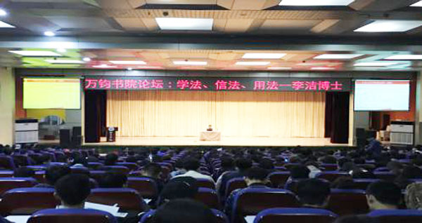 会上李洁博士通过法律概述、日常生活中常用的法律、大学生必备的法律素质三个模块对“法”进行了全面剖析。首先,李洁博士对法的概念进行了阐释,并指出法律与舆论、道德、习俗等其他社会规范的关联。其次,通过列举民法、婚姻法、刑法、经济法以及网络法等十大法律的真实案例,深入浅出地展示了当前大学生在法律方面的缺陷,让大家敲醒了法律的警钟。最后,李洁博士提醒大学生要处理好情与法的关系,生动形象地运用“苏格拉底的慎重”的故事提醒学生们自觉遵纪守法,做“学法、信法、用法”的优秀大学生。