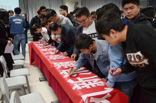 最后学生干部进行签字并宣誓:端正态度,养成习惯。不畏艰难,不断进取。专心致志,勤学苦练。勤字当先,苦字当头。专心听讲,勤做笔记。认真作业,课后复习。夯实基础,理清脉络。弄清疑点,强化重点。考前复习,认真答题。考后看书,积极纠正。诚实考试,杜绝作弊。树立理想,肩负使命。从我做起,从现在做起,做一个优良学风的创造者,做一个遵章守纪的带头人,做一个勤奋学习的好模范。
