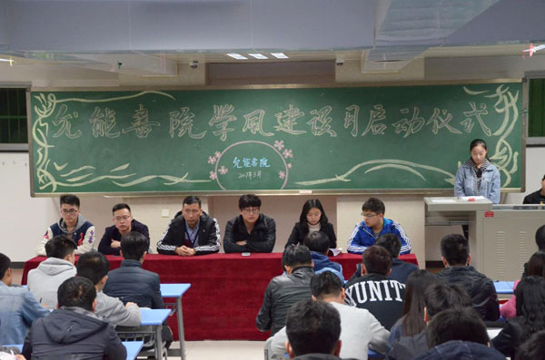 西京网讯:为营造书院学习氛围,加强书院学风建设。3月2日,允能书院2015、2016级学生干部在1329教室举行允能书院学风建设月启动仪式,允能书院发展科科长马晓腾、学风建设职能中心指导老师常晓娟、冯林及部分辅导员参加。