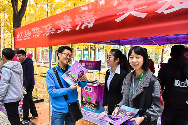 学生干部在璞玉餐厅对面设置宣传点,进行预防艾滋相关知识讲解,并向过往同学分发宣传资料及预防物品,呼吁同学们关注艾滋病的预防,关爱生命。