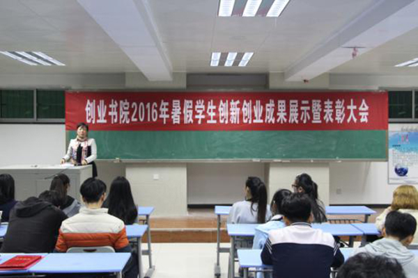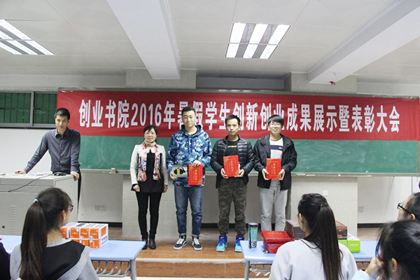 创业书院王素兰院长宣读了“创业书院2016年暑假学生创新创业成果表彰决定”;随后依次为一等奖、二等奖、三等奖、最佳班级组织奖、优秀辅导员组织奖获得者颁奖;接下来宏猷班严娜、毅创班贺林两位同学代表获奖学生分表上台作了发言。