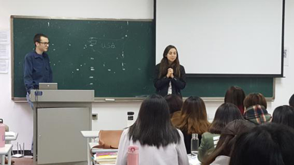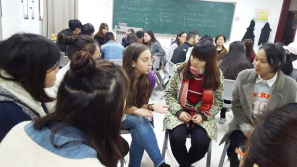 为更进一步促进国际交流,外语系部分教师将美国留学生带进课堂,与学生进行交流。三位美国留学生与我校英语专业学生就文学作品中的人物角色等话题进行讨论交流,体验各自文化的异同。同时,该系汉语国际教育的学生为留学生讲授简单的汉语口语,既为双方提供了彼此交流的机会,同时也提高了学生的英语对话能力。