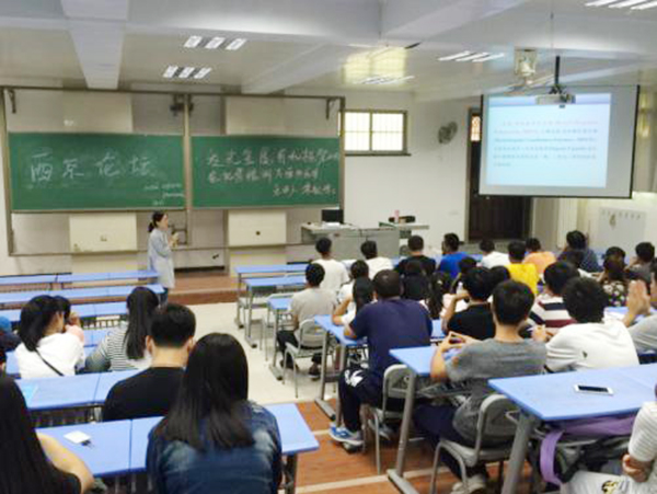 朱博士生动的讲述了金属有机框架材料的研究背景及发光金属有机框架材料在化学检测,简单介绍了MOFs发光材料的迷人结构,发光MOFs的不同种类,着重评述了以稀土为中心的发光 MOFs 作为有机小分子、 阳离子和阴离子荧光探测的研究进展,提出了探针用发光 MOFs 研究目前存在的问题和今后的发展趋势。学生们反响热烈,积极参与互动,整场报告取得了很好的效果。