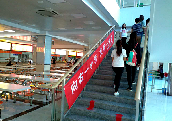 在放学高峰期,分团委和学生会的干部们当起了“文明行动”的志愿者,在教学楼及宿舍楼前拉起了红线,并在餐厅楼梯和主要的路段竖起了宣传牌,引导学生自觉靠右行,并及时制止逆行等不文明的现象。
