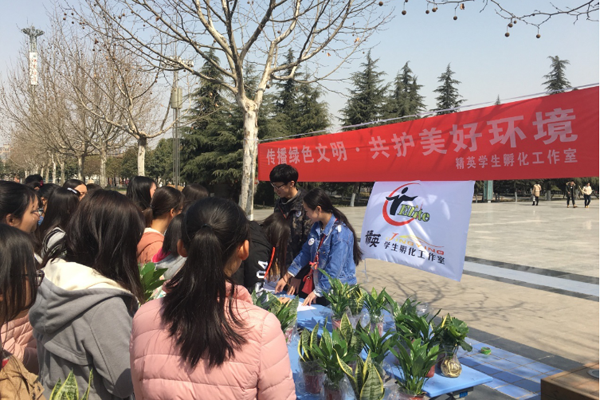 在发放绿植的活动间隙,精英学生孵化工作室的成员们还不忘给学生普及绿色环保知识,宣传绿色环保理念,并号召大家都加入到护绿、养绿、美化环境活动的行列中。