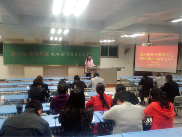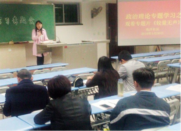 为进一步增强教工党员的党性修养,开拓党员视野,提高党员的政治敏感性与鉴别能力,3月30日下午19:30,南洋社区分党委在一号教学楼1208多媒体教室组织全体党员观看了纪录片《较量无声》,全体辅导员参加了此次专题学习讨论会,本次会议由社区分党委书记庞舒月主持。