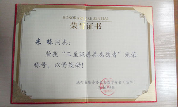 近日,在陕西省慈善协会召开的2015年慈善志愿服务总结表彰暨2016年“3.5”志愿服务活动周动员大会上,我校璞玉社区米栋同学荣获“三星级慈善志愿者”荣誉称号,大会对此进行了表彰,并颁发了荣誉证书。